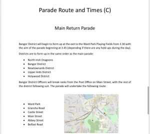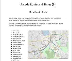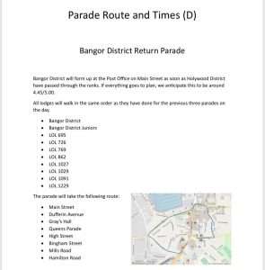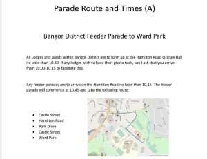 In a change to previous years, the platform proceedings will take place before the main parade. Bangor District will form up at Bangor Orange Hall on Hamilton Road and make their way to the field at Ward Park from 10.45am.